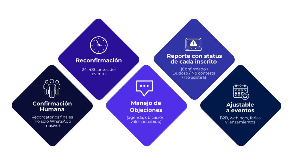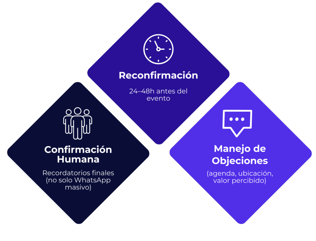 Llamamos, resolvemos objeciones y dejamos confirmación concretade los inscritos para aumentar la asistencia presencial o virtual, sin saturar al equipo.